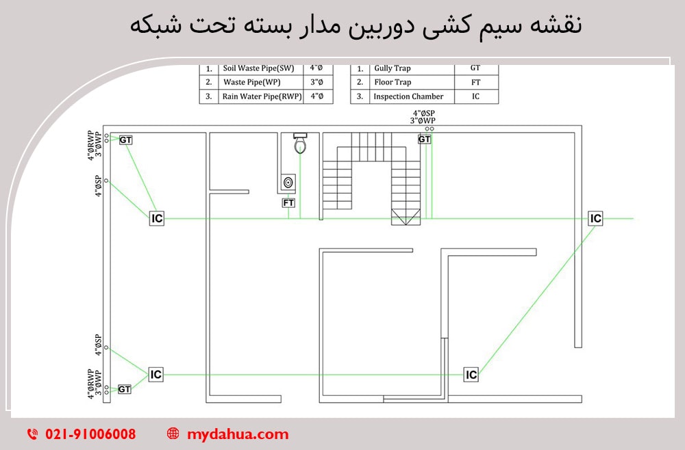 ۳. طراحی نقشه سیمکشی: نقشه سیم کشی دوربین مدار بسته تحت شبکه باید شامل موارد زیر باشد: